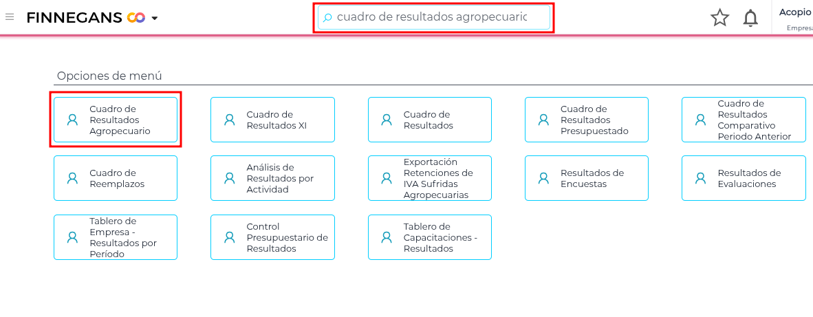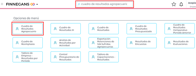 Para ver esta funcionalidad, se debe buscar en el buscador Cuadro de Resultados Agropecuarios y elegir la opción deseada.