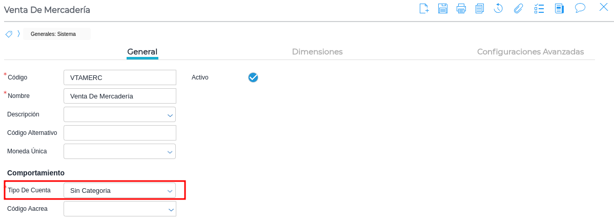 Las cuentas deben tener asignada el “Tipo de Cuenta” como se detalla en la siguiente imagen: