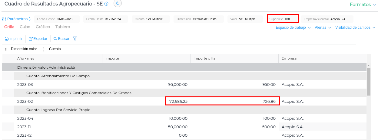 Como se puede apreciar en la imagen anterior se presenta el parámetro de superficie. Dicho valor será por el cual se dividirá el importe de cada línea del informe: