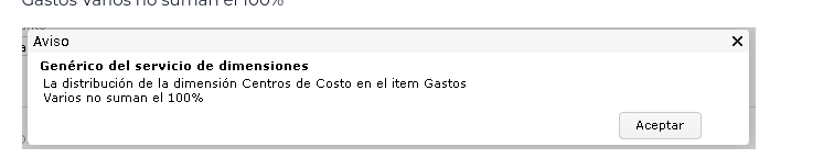 El sistema emite el mensaje “La distribución de la dimensión (nombre de la dimensión) en el ítem (nombre de la cuenta) no suman el 100%” cuando se intenta guardar una transacción , en este caso una factura de compra .