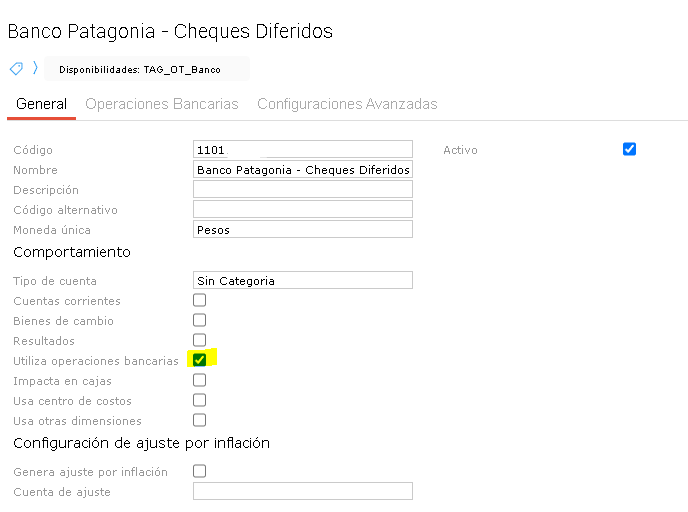 2- En el registro de la cuenta, en la solapa “General” marcar “Utiliza operaciones bancarias”. Aparece la solapa “Operaciones bancarias”