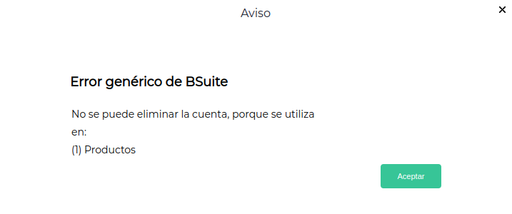 El mensaje se visualiza porque la cuenta contable se encuentra asignada a un producto. Antes de eliminar la cuenta contable no debe estar configurada en ningún producto.
