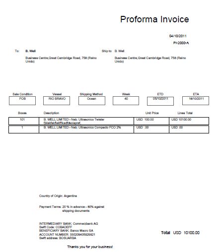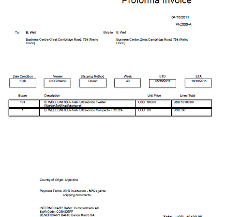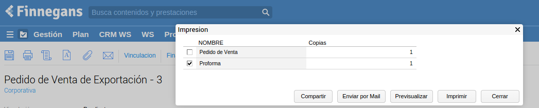La impresión del pedido de exportación es la Factura proforma que se envía al comprador.