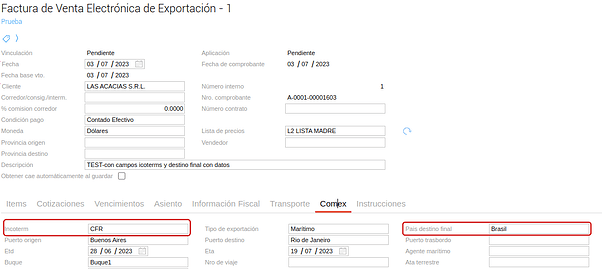 Para este tipo de operación el sistema requiere que se indique el cliente que solicita la mercadería, las condiciones de pago, las cantidades y el precio que se acuerda entre las partes. El país destino se completa en el encabezado en el campo Provincia Destino