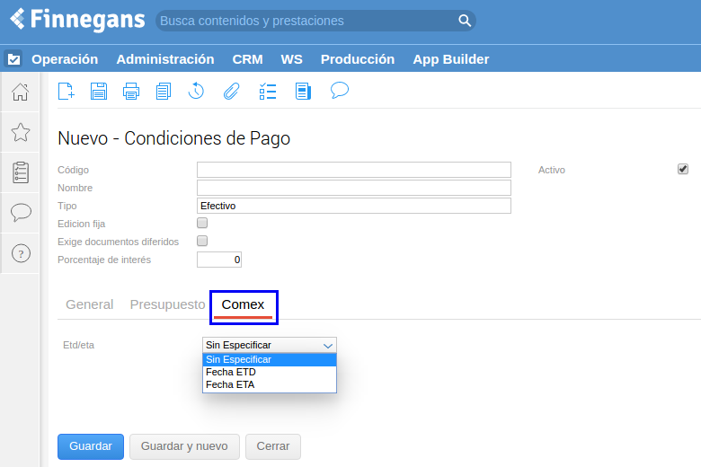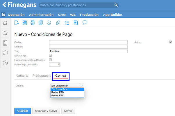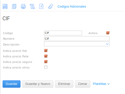 Este campo despliega los Incoterms configurados en el maestro. En función de este dato las columnas FOB, Seguro y Flete serán editables o no. Esto lo especificaremos en la configuración de dicho maestro.