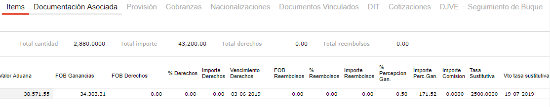 Esto se muestra en la solapa Ítems del Permiso de embarque: