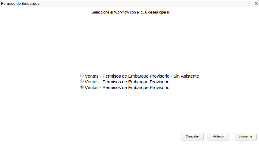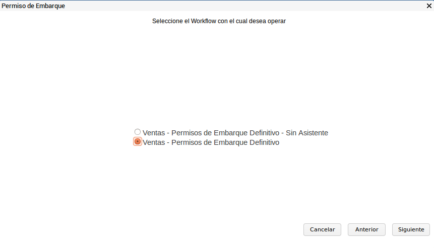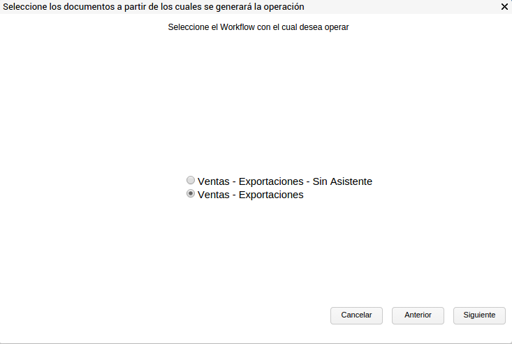 El sistema despliega un asistente con los workflows intervinientes en la operación en este caso solo muestra el de exportación: