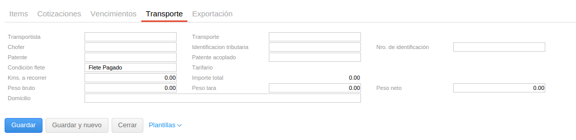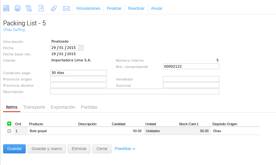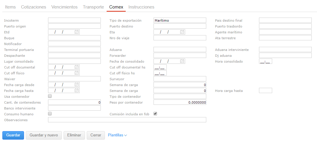 No es necesario completar los datos de esta solapa para guardar el pedido de exportación. Los datos son informativos y podremos ir completando los mismos a medida que los obtengamos. Dichos datos servirán para informes.