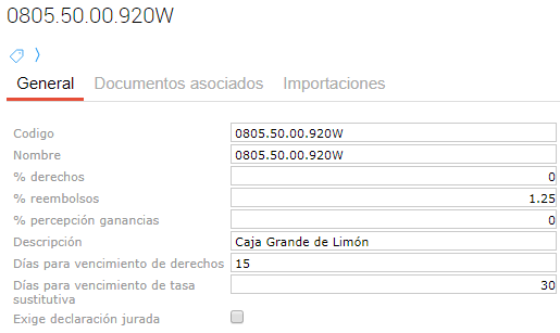 Los datos de % de derechos y % de reembolsos y la fecha de vencimiento, vienen dados, se encuentran configurados en el ABM de la posición arancelaria.