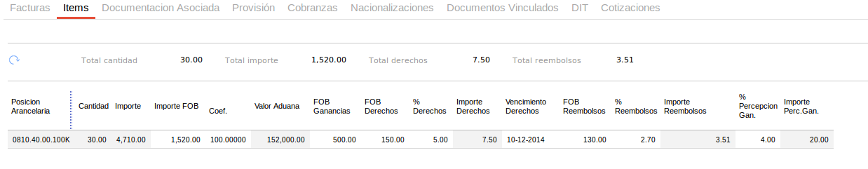 Una vez incorporada la factura en la solapa Ítems se incorporan automáticamente los Ítems de la misma con el código arancelario correspondiente a los artículos de la factura. Este código se configura en el artículo.