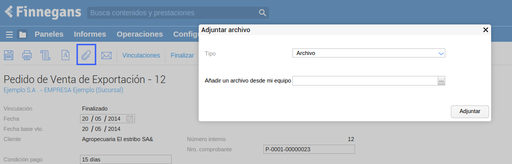 Podemos adjuntar documentos relacionados con la operación desde el pedido de exportación presionando el botón adjuntar.