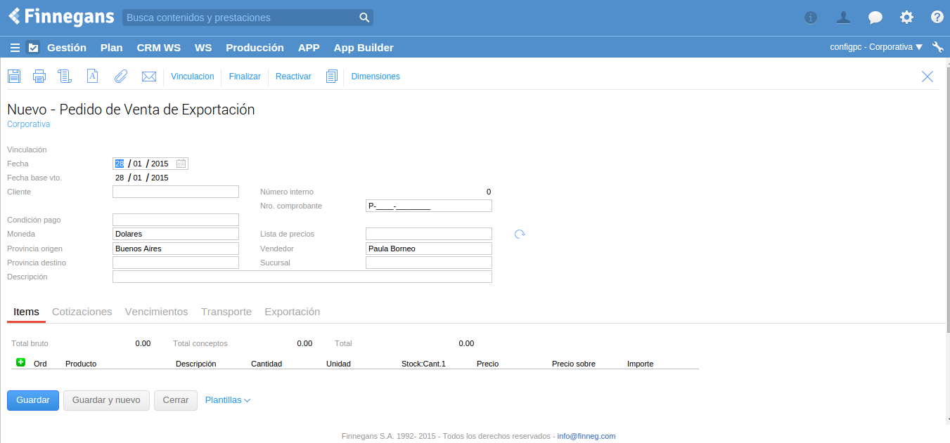 El pedido de venta de exportación es una herramienta que propone el sistema mediante la cual se cargan todos los datos de los pedidos que realizan los clientes de exportación.