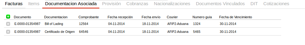 Solapa Documentación Asociada: Trae las facturas asociadas y puedo adjuntar otro tipo de documentación relacionada con la factura por ej. Certificados de Origen, Formulario A, B/L,SENASA, etc.