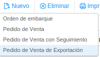 Para un nuevo pedido de venta de exportación se selecciona el documento “pedido de venta de exportación” y luego se presiona el botón nuevo.