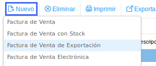 Luego se presiona el botón Nuevo y se selecciona el documento Factura de venta de exportación.