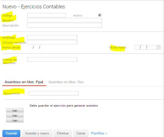 - Completar los campos en amarillo correspondientes al ejercicio que se está dando de alta.