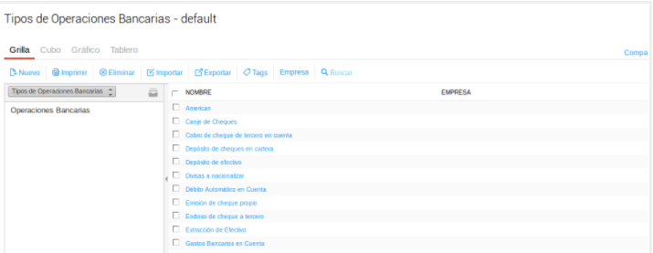 1- Acceder a través de Menú → Operación → Tesorería → Más Maestros → Tipos de Operaciones Bancarias.