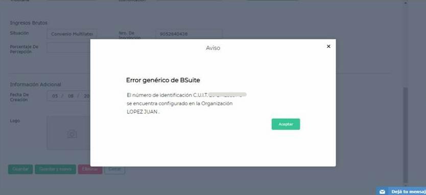 Al dar de alta un nuevo proveedor , el sistema arroja el siguiente mensaje de error “El número de identificación C.U.I.T se encuentra configurado en la Organización”.: