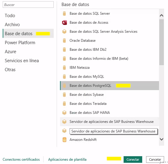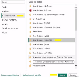 b. Clickear en Base de datos, seleccionar Base de datos PostgreSQL, luego clickear en Conectar
