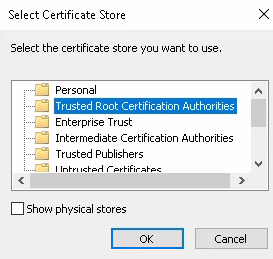 d. Seleccionar Trusted Root Certification Authorities (Autoridades de certificación raíz de confianza), presionar OK y Next (Siguiente)