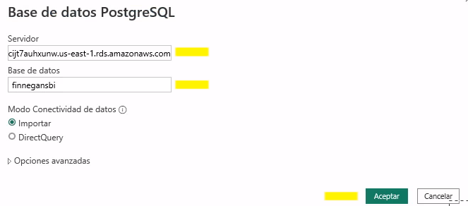 c. Ingresar la URL del servidor, base de datos y clickear Aceptar