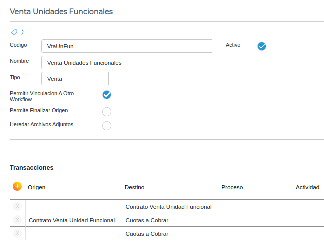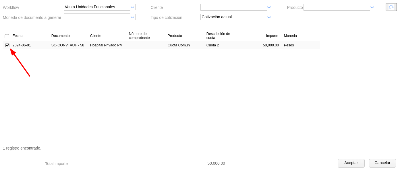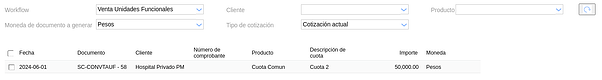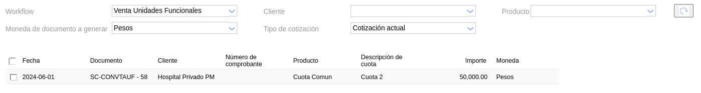 Una vez guardado, clickear en Generar facturas y elegir el workflow de “Venta Unidades Funcionales” y seguidamente en el botón ![]()