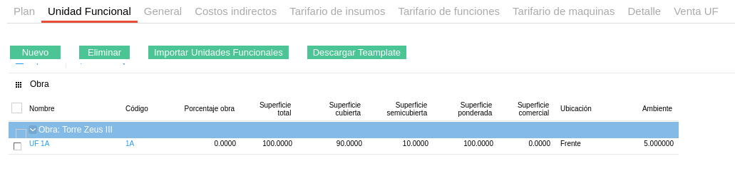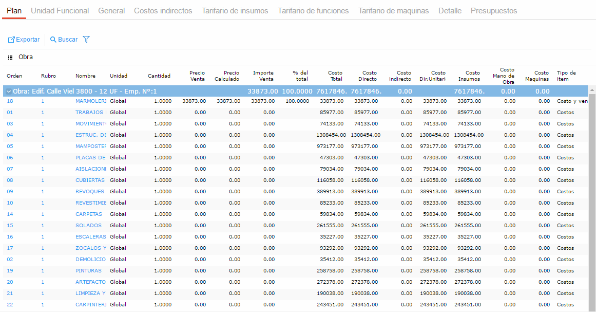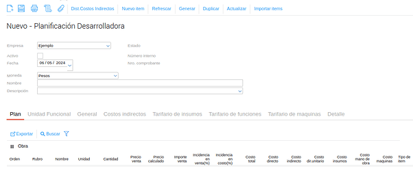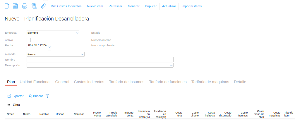 A continuación se realizará un ejemplo de la carga detallada de un plan considerando que la empresa realiza tanto la venta de las unidades funcionales como la construcción de la obra.