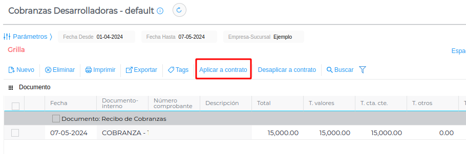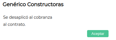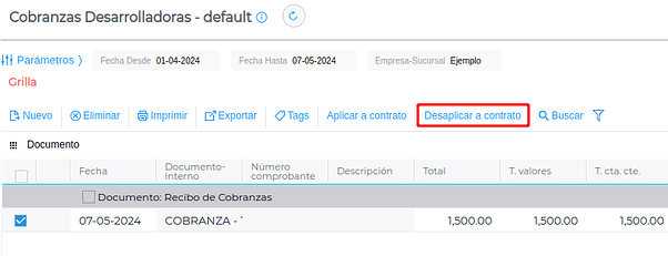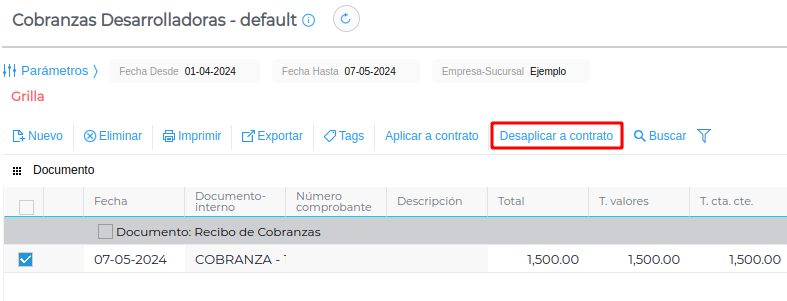 Si se desea, también se puede desaplicar una cobranza a un contrato mediante el botón “Desaplicar a contrato” que se encuentra en la grilla de las cobranzas: