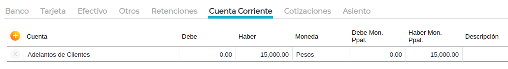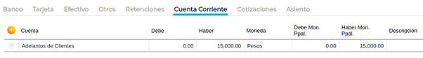 En la solapa Cuenta corriente se debe usar la cuenta “Adelanto de clientes”. Para balancear el asiento, se debe seleccionar el método de cobro y el monto.