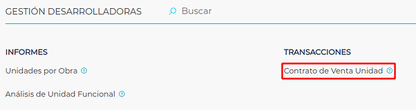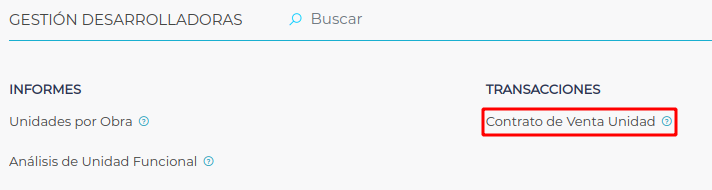 Se accede a través de Menú → Obra → Gestión desarrolladoras → Transacciones → Contrato de venta unidad