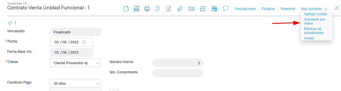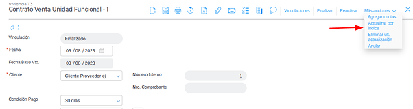 Para actualizar el índice desde cada contrato, se ingresa al contrato que se quiere actualizar y se presiona el botón Más acciones → Actualizar por índice: