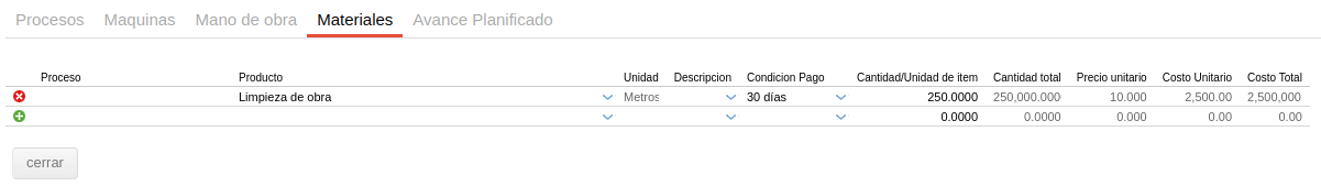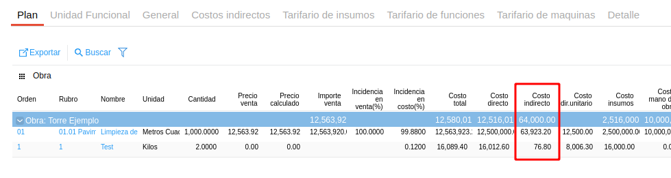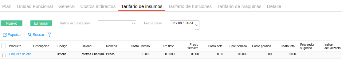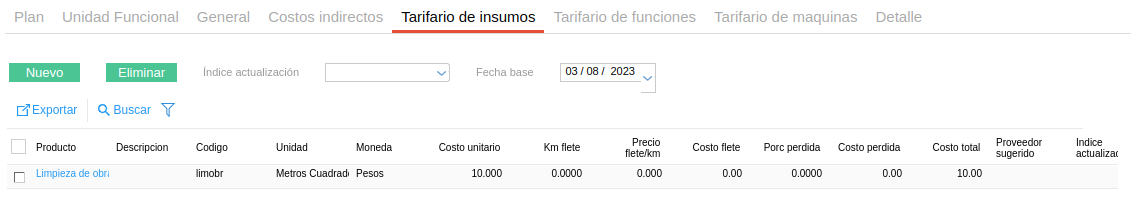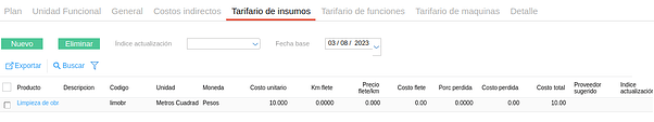 - Precio unitario: el indicado como costo estándar en la solapa “precio” del maestro de producto o el definido en la solapa “Tarifario de materiales” dentro del Plan de obra.