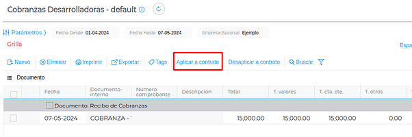 Una vez guardada, se debe ir a la grilla de cobranzas, seleccionar la cobranza que se desea tomar como adelanto de saldo y presionar el botón “Aplicar a contrato”: