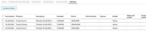 Y en la solapa abonos se van a reflejar todas las cuotas indicadas con su precio y fecha de vencimiento: