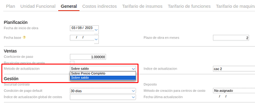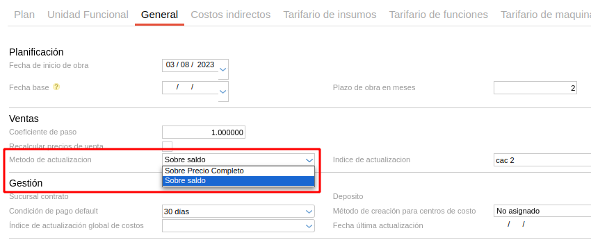 También, al cargar el plan de desarrollo inmobiliario se debe especificar el método de actualización del índice en la solapa general anteriormente.
