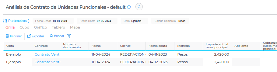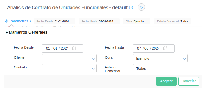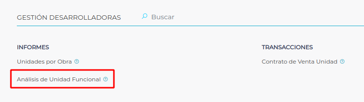 Se ingresa al mismo desde Menú → Obra → Gestión desarrolladoras → Informes → Análisis de unidad funcional