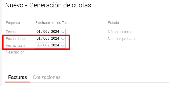 Luego, se completan los campos de Fecha desde y Fecha hasta. Este período se referirá al período en el que hay vencimientos de cuotas