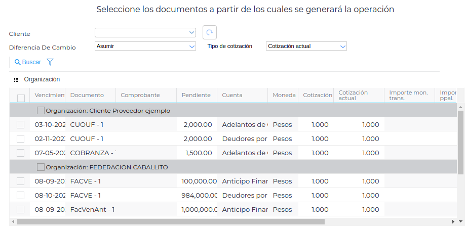 - Moneda de documento a generar: será un desplegable con el maestro de Monedas. Esto indica qué moneda tomará el sistema al momento de generar las cuotas que se seleccionen.
