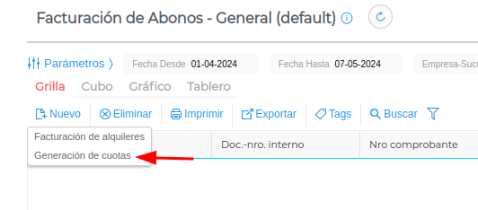 Se presiona el botón “nuevo” y se selecciona la opción “Generación de cuotas”