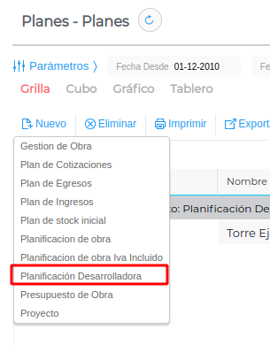 Para cargar el plan de desarrolladora accedé desde Menú → Gestión empresarial → Presupuesto → Transacciones → Planes.