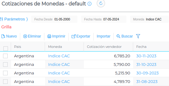 Recordar que previamente se debe definir y actualizar la cotización del índice a la fecha correspondiente, desde Menú → Gestión empresarial → Contabilidad → Maestros → Cotizaciones de monedas