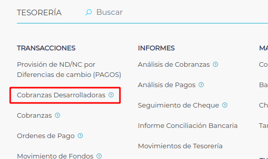 Realizar una cobranza desde Menú → Gestión empresarial → Tesorería → Transacciones → Cobranzas desarrolladoras.