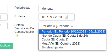 Criterio Descripción De Cuotas/Alquiler: puede ser por el período de la cuota, por el número de la cuota en base a un total, por el número de cuota única, por mes y año, o sin descripción