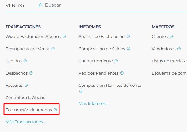 El siguiente paso es devengar las cuotas correspondientes para cada cliente. Para ello, se corre el proceso de “Facturación de abonos”. Para ello se debe ingresar a Menú → Gestión empresarial → Ventas → Transacciones → Facturación de abonos.