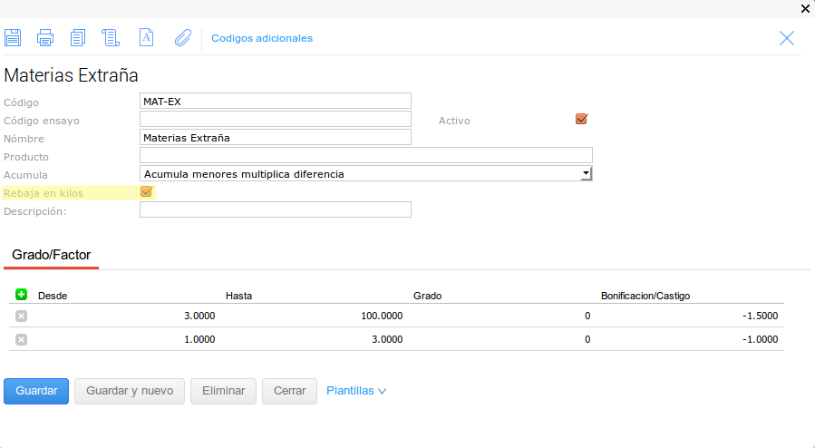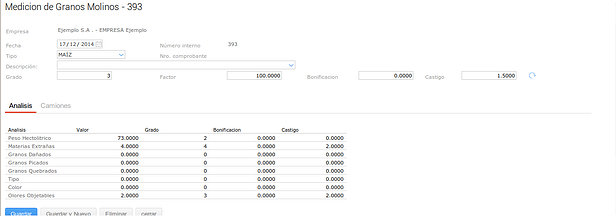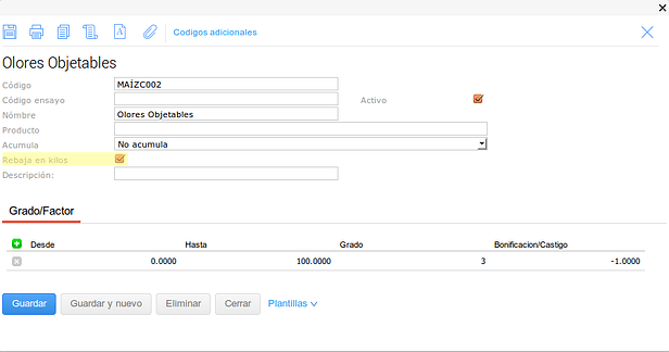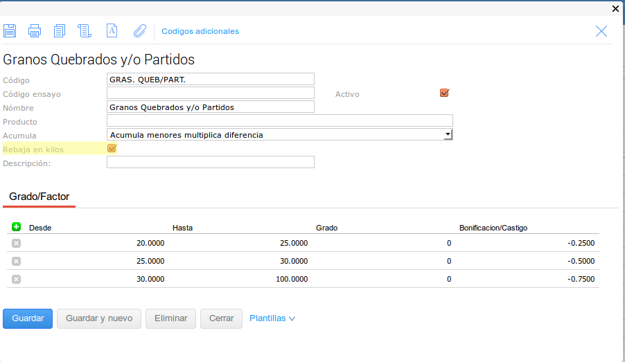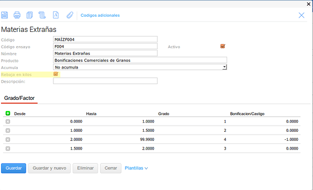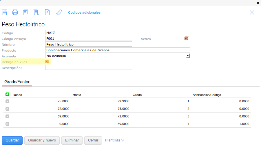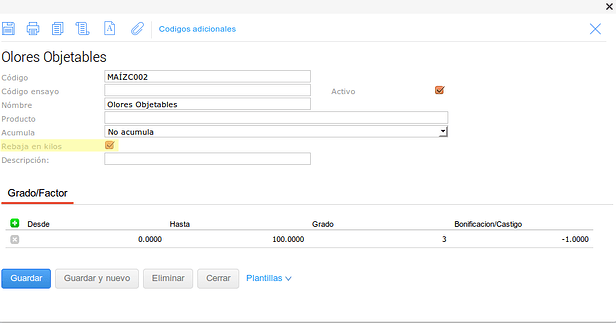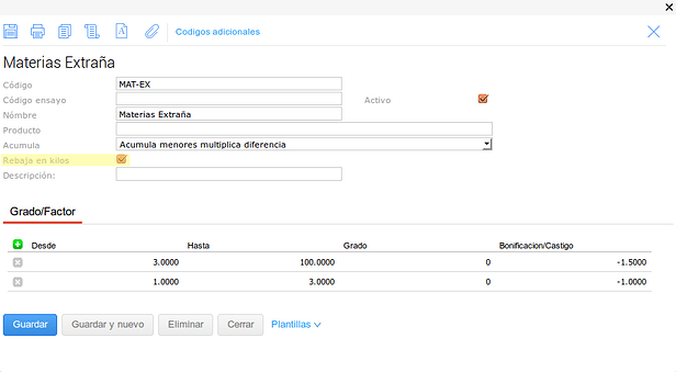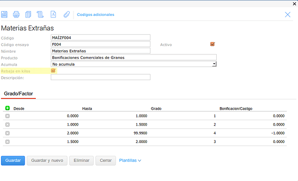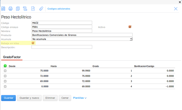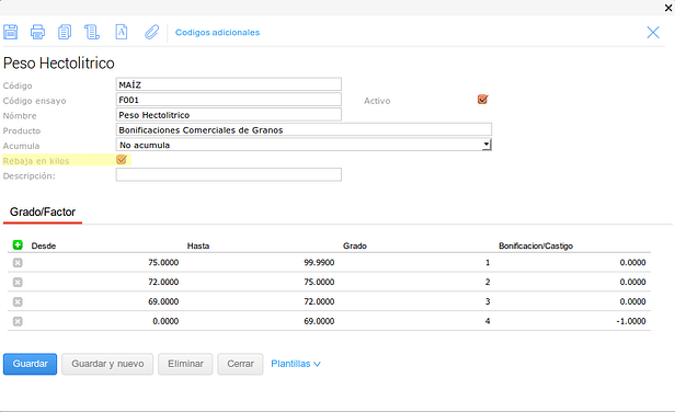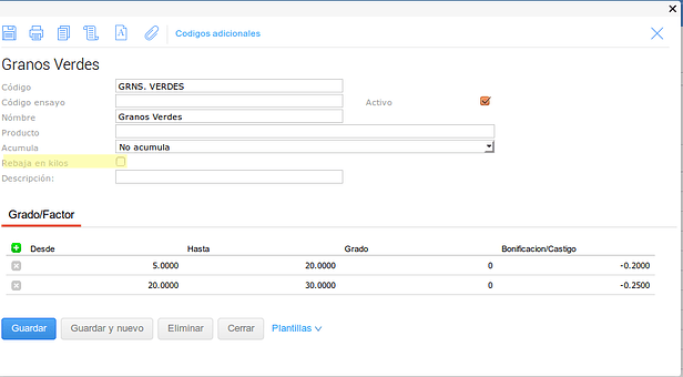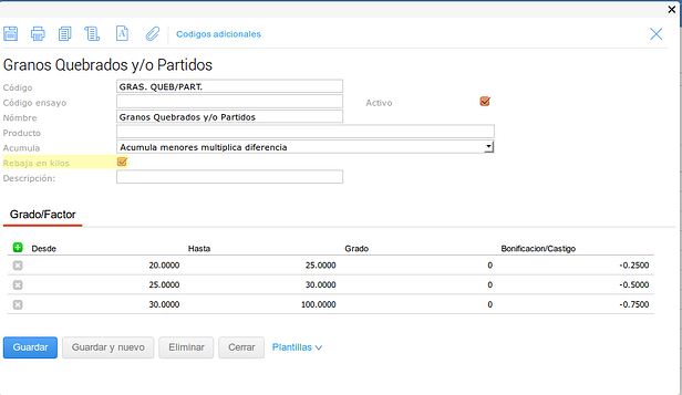 En este último caso se configuró el tipo de medición para que no haga descuentos en kilos sobre el Grado pero pero si sobre el Factor.