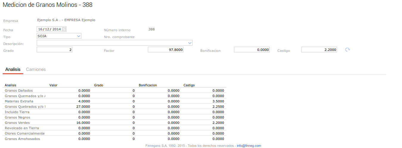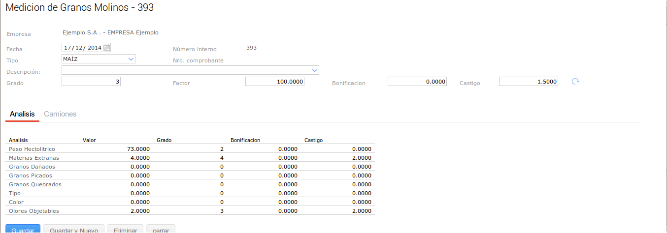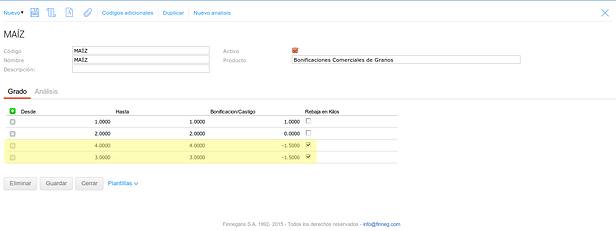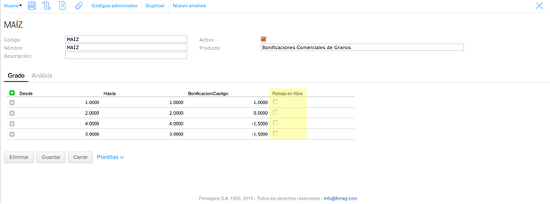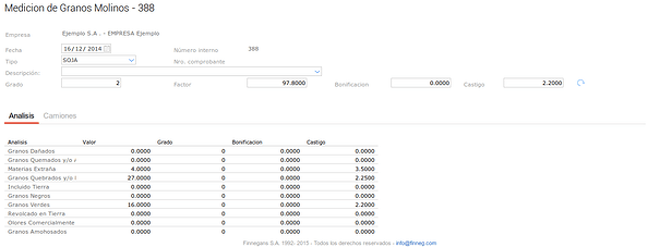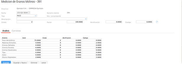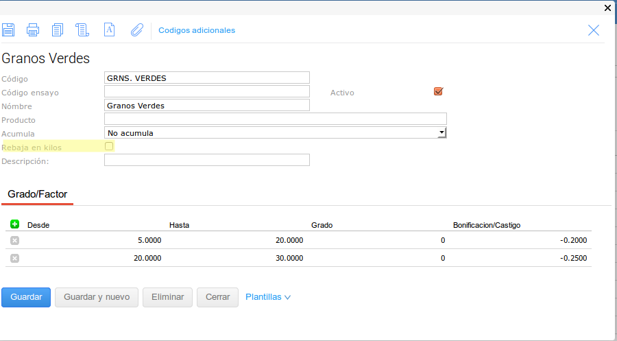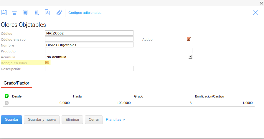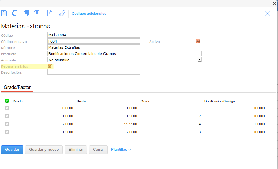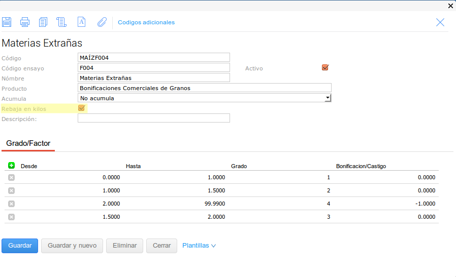 En este último caso se configuró el tipo de medición para que no haga descuentos en kilos sobre el Grado pero pero si sobre el Factor.
