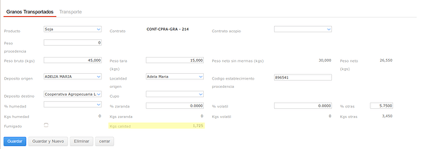 Como se puede apreciar en la imagen, existe un nuevo campo que se llama “Kgs calidad” que muestra los kilos que se descontaron del Trasl. de Granos debido a la Medición de Calidad que se cargo y que se vínculo al mismo. Esta Medición de Calidad de Granos es la que contiene los valores del Análisis de Calidad que se le hizo oportunamente a la muestra que se toma del camión que transporta los granos.