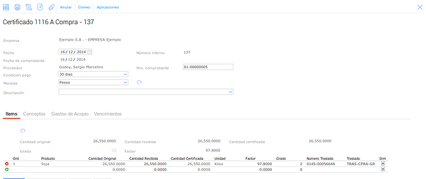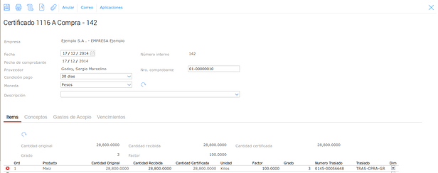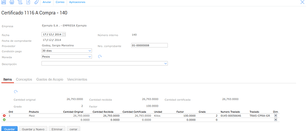 Luego debemos certificar el Trasl. de Granos, para esto vamos a dar de alta un nuevo Certificado 1116 A, para hacer esto vamos a: Granos → Compras → Certificados 1116A: