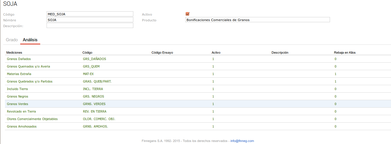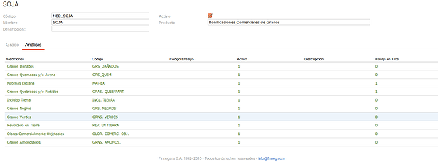 Los valores correspondientes a las lecturas de materias extrañas, olores objetables y peso hectolítrico no realizan un descuento en el factor de la medición de granos, pero dado que el valor de lectura les corresponde un valor de grado que no aplica rebaja en kilos se realiza en la medición de granos una rebaja en grado.