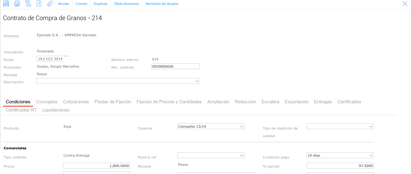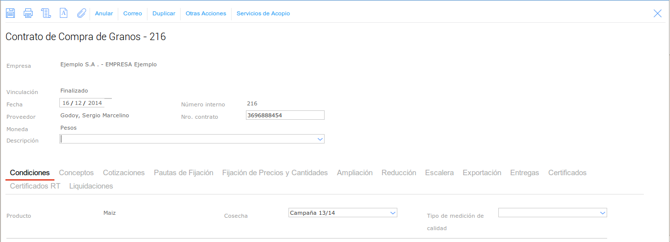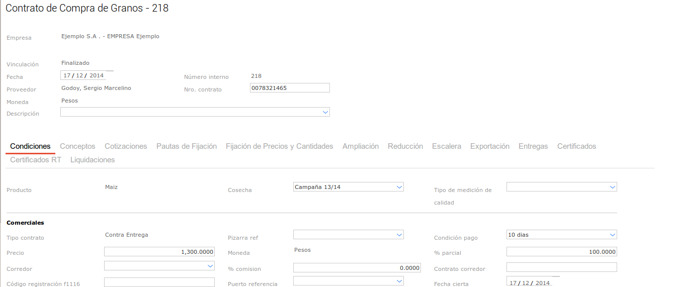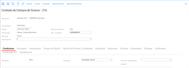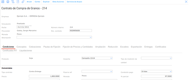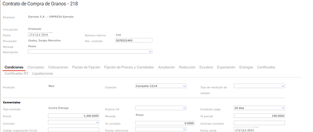Para esto vamos a dar de alta un Contrato de Compra de Granos, yando a Granos → Compras → Contrato: